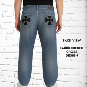 Featuring a baggy leg fit for relaxed comfort and standout black cross designs on the back pockets, these jeans are both bold and stylish.