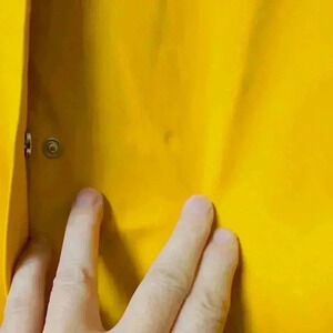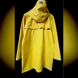 Be ready for rainfall with this great slicker! Made with Helly Hansen’s waterproof Helox+fabric technology, this previously owned raincoat keeps you dry in a downpour. The style was inspired by the brand’s 1950s fisherman’s raincoat. Its 100% Polyurethane Helox+ fabric it is also PVC free. Attached hood with chin guard. Lower flap front pockets. Ventilation holes under back yoke, welded seams, full zippered front closure with snap buttons at top and bottom of weather flap and on back yoke complete this well appointed 344 Essential Yellow colour raincoat. Slight mark, dimpling imperfections and small oval label imprint on back of coat reflected in low price.