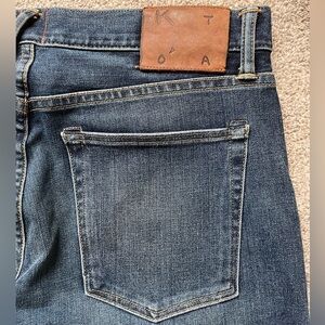 Mens Hiroshi Kato selvedged denim jeans the pen rain 10.5 oz selvedge slim fit size 32x30 with a 7” leg opening in excellent well cared for condition with no stains or flaws at all. Made in USA with imported materials. Slim fit, medium rise, vintage fade Indigo Japanese 10.5oz 4-Way Stretch Selvedge, zip fly, premium leather patch, and custom-branded hardware. Made in USA.
