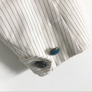 Features a slim cut with light grey pin striping over ivory. Zippered detailing with fancy buttons and embroidery details. Some minor pilling on right hand shoulder (as shown). Always a conversation piece! By Subscribe.