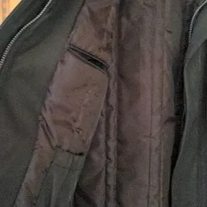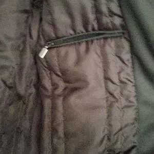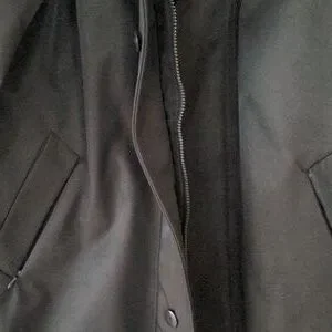 Jones New York, nylon shell and polyester lining. several pockets inside and out. Button and zipper front closure. Was worn only once.
