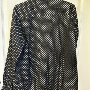 This is a lovely John Lennon shirt that says it all and with a British accent. Black with silver/grey rectangular check, double flapped buttoned breast pockets, contrasting print cuff lining, snap bottom button with the JL stitched logos on the right hand shirt tail and the stitched peace symbol on the lowere right hand sleeve. All the markings of a genuine JL shirt. It's a Large but it's not baggy. Wear it tucked or untucked, to a wine & cheese party or to the Oscars, you will look great anywhere in this beauty. These shirts sell for 130 and up new. This one is in like new condition.