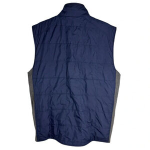 A perfect lightweight but warm extra layer for the course! Blue quilted body with contrasting grey Merino wool lining and ribbed sides. Full Zip. High neck. Inner zippered pocket. Outer zippered chest pocket.