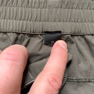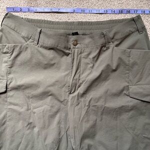 Mens Lululemon 8” Utility Cargo Shorts size 38 waist in excellent like new condition. Perfect for any of your favourite outdoor activities with large cargo pockets as well as front pockets and a rear zipper pocket. Nice stretchy material and a stretchy waistband for all day comfort. Colour is a nice sage earth tone colour. These are made of a water resistant material.