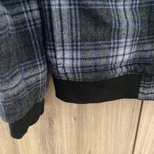 Plaid Mavi bomber jacket in size men's large. The jacket features a front zip and button-up closure, horizontal front pockets, a fleece collar, and in blue and grey. It has waist and wrist cuffs and is fully lined.