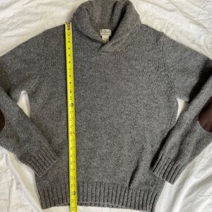 This sweater is in excellent, clean condition. It has brown faux suede elbow patches, a classic cowl colour, and is a warm heather grey. The sweater is a classic L.L. Bean style.