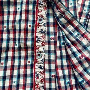 Elevate your wardrobe with the Men's Modern Fit Plaid Shirt. Featuring a stylish red, blue, and white plaid pattern, this shirt offers a contemporary look for any occasion. Perfect for both casual and formal settings.