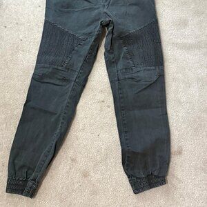 Features ribbed moto panels at the knees, elastic waistband with drawstring, and cuffed ankles for a fitted, modern style. Great for everyday wear, workouts, or casual outfits.