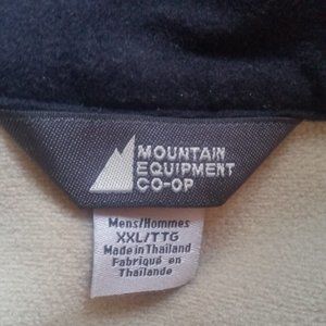 Men's Mountain Equipment Co-op beige zippered light jacket. Contrasting black under arm and bottom of sleeve. Toggle drawstring at bottom. Zippered pockets. Size XXL NWOT
