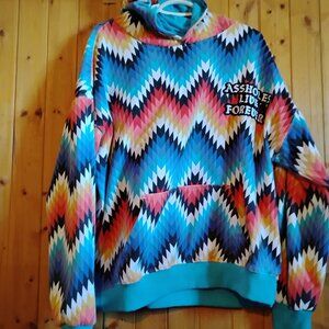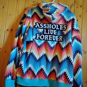 A men's multicolor size XL hoodie featuring the Assholes Live Forever text logo embroidered on the front and back. Hoodie has been worn a handful of times but is still in very good condition.
