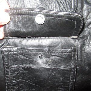 Hello. I'm sorry for the delay as I was away for the holiday weekend. I wasn't able to figure out how to attach pics to your message so I have added 2 pics to the listing itself showing the pinholes on the left pocket and pocket flap as well as the inside of the flap as requested. Hope this helps.
