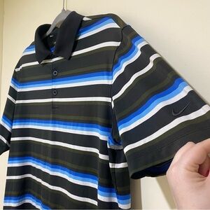 Men’s Nike Dri-Fit Men's Short Sleeve Polo Shirt XL Blue and Brown Striped Polo. Size M. In great condition no issues or flaws. Sporty and lightweight. Polyester and spandex blend.