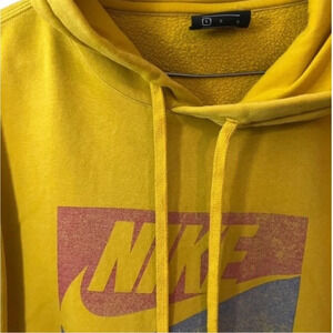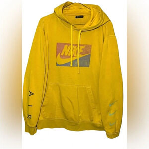 Stay cozy and stylish with this Nike Air pullover hoodie in a bold mustard yellow. Perfect for casual wear or lounging, this hoodie is both comfortable and practical. While the logo on the front has some fading, the hoodie itself is in great condition with a small mark on the front barely noticeable and ready for its next owner!