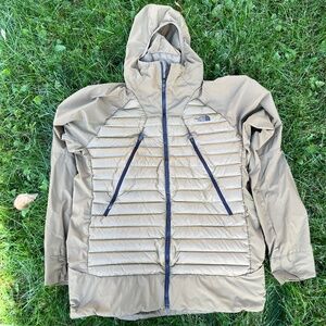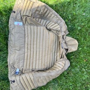 Excellent used condition, no rips, tears or stains. Cuffs are also in immaculate condition. Hardly worn. Front and back torso are 800 fill goose down, sides and arms are windbreaker material with no insulation. Jacket is more of an olive green colour, the indoor photo is a more accurate colour representation.