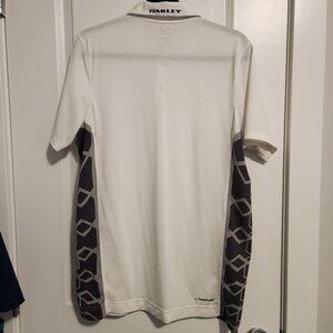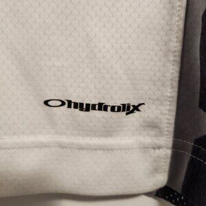 Stay cool and sharp on the course or in the city with this Oakley Hydrolix Polo Shirt in size Medium. Featuring Oakley's signature moisture-wicking Hydrolix fabric, this polo is designed to keep you dry and comfortable during any activity. It features a sleek white base with bold geometric black side panels, breathable mesh construction, and sharp logo detailing on the front, collar, and back hem.