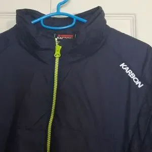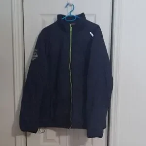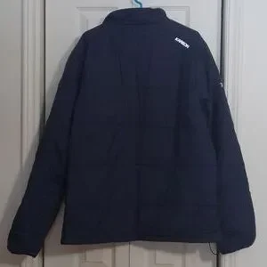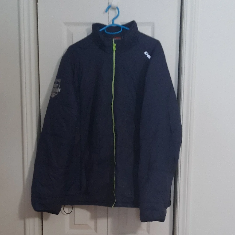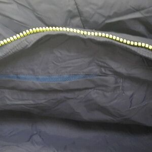 light weight men's performance jacket Quilted design, has zippered hand and interior pockets. toggle pulls at the bottom for snug fit. missing hood. bright yellow full front zipper