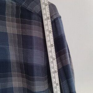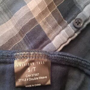 Brand new with tags. From American Tall, this blue/navy/grey plaid shirt has button-down details but casual fabric and fit. Looks fantastic with jeans. It measures 16” flat across the shoulders/upper chest and 28” down the front, and the sleeve length is a whopping 30”. 100% cotton. Care instructions as in photo.