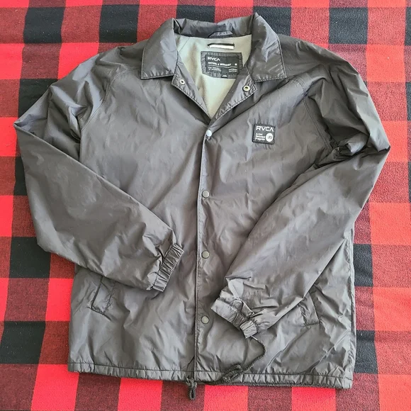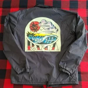 Great condition men's black medium RVCA coach's jacket with large design on the back.