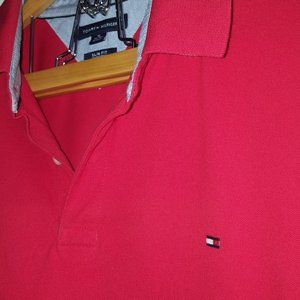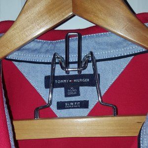 Excellent condition, never worn Tommy Hlfiger Polo Shirt with collar that is red on top (when folded down) and underneith collar is striped blue, white, and gray. The collar can be worn up or down. The polo is a slim fit and is a great cool red color, perfect for summer.
