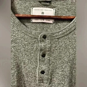 Mens Reigning Champ long sleeve Henley shirt in excellent condition size large. Measures 22” with stretch to 23” pit to pit and 30” top to bottom.