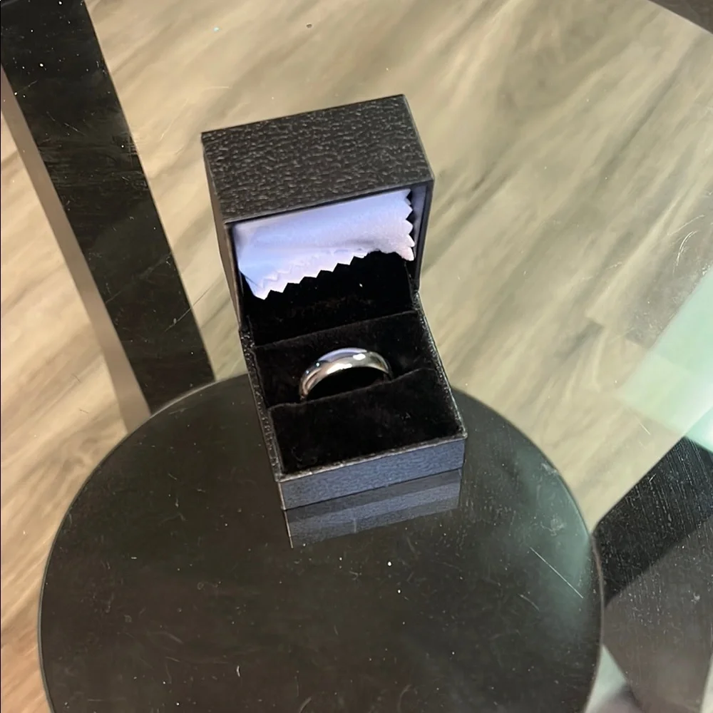 Brand new, my boyfriend tried it on once and it didn’t fit him. White tungsten carbide ring, size 11. Small engraving on the inside.