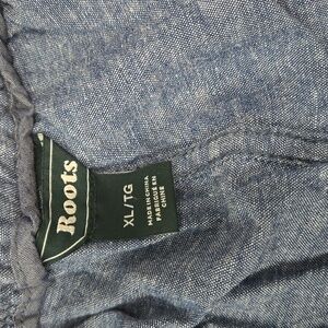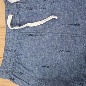these are men's drawstring waist shorts. it's a denim colorway with little paddle prints all over it. it's approximately an 8-in inseam