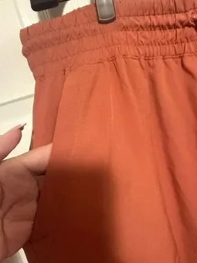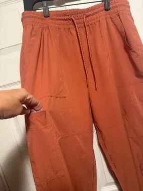 Comfortable men's jogger pants in a warm rust color. Elastic waistband with drawstring for an adjustable fit. Lightweight fabric designed for all-day wear. Side pockets add practical storage. Versatile styling for casual or active looks.waist it 19 inseam is 26