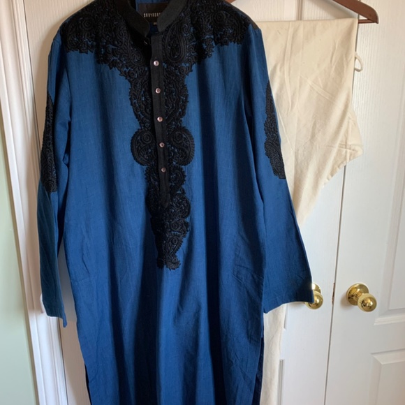 100% cotton and silk men’s set in blue with black embroidery. Size L/XL/44 kurta, size 44 pajama bottom. Perfect condition.