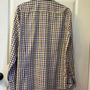 If you've owned a Serica shirt you'll know their qualoty, and this is one of their top tier casuals. It's a colorful weave of navy, pale blue, orange, cream and light brown that says both casual and dressy in the same breath. The tab collar keeps the neckline looking neat and the pale blue paisley lining on the cuffs lends the shirt some class. 100% cotton, substantial but lightweight. This shrit can stand on its own out on the town, or liven up a navy blazer for a day at the office. Serica shirts sell for well over $100 new. This one is in excellent condition. It is a Large, but it has the classic Serica side darts in the back that makes it look trim.