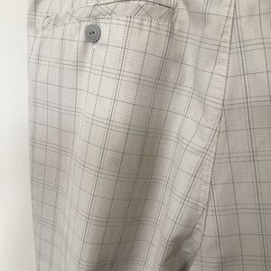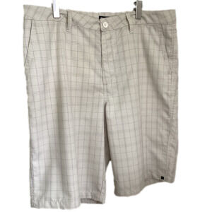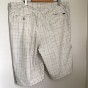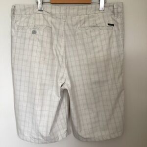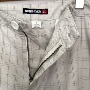 Quiksilver white plaid shorts size 38. These shorts are in good condition with a small mark/discolouration on the back below the pocket. Please see pictures.