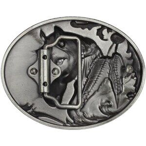 Men's Silver Norse Viking Horse Engraved Feather Leaf Head Oval Belt Buckle