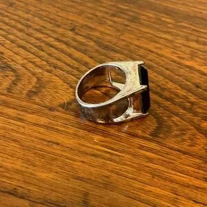 Silver tone, size 9 men’s ring, featuring a large black onyx style stone and a classic silver band. Band is tarnished, see photos.
