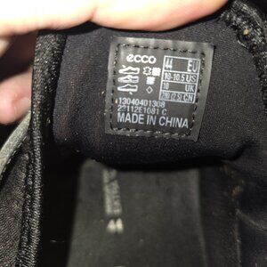The product is a pair of men's ECCO Biom C4 golf shoes in size 10.5 with a wide width. These spikeless golf shoes feature a lace-up closure, Goretex fabric, and a rubber outsole with moderate cushioning. The shoes are designed for comfort and water resistance, making them suitable for all seasons. The gray and white color scheme, along with the ECCO logo accents, give the shoes a stylish and sporty look. Perfect for activewear during golfing or other outdoor activities.