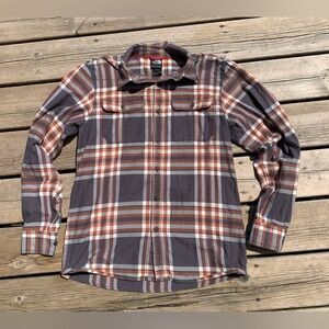 The North Face Men’s Small Flannel Shirt. Colors are Burnt Orange/Blue/White. Pre loved but in excellent condition