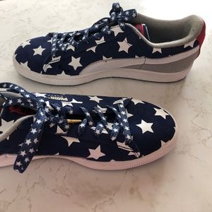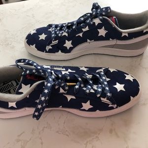 Puma sneakers. US size 8.5 men’s. Never worn Navy. White stars. Red on heels