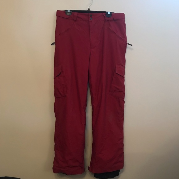 Good condition red men’s size medium snow pants. Slight discolouration on one knee and near the top on the back (only superficial).