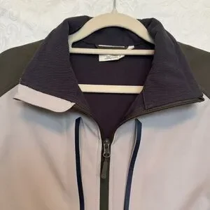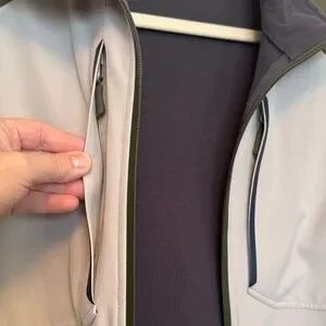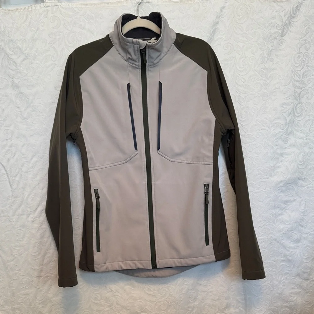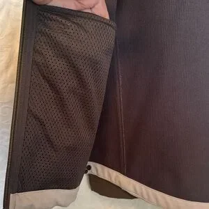 Army green sleeves and beige body. Green zipper, the collar can be worn up or down. Two large zipper pockets on the chest and two large zipper pockets on the front of the jacket, there are also two large mesh stuffed pockets inside! See images for best review! Stylish, clean and comfortable. Perfect for any weather. Men’s Small.