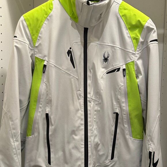 Beautiful mens Spyder ski outfit in great condition. The jacket is light grey with neon green accents. The Spyder pants are neon green to coordinate with the jacket. A very slick look on the hills.