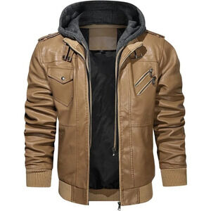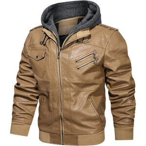 Men’s Stand Collar PU Faux Khaki Leather Zipper Motorcycle Bomber Jacket