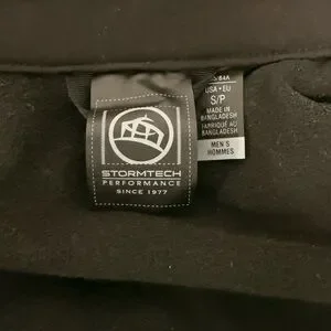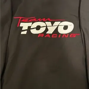 Black softshell jacket. Features a full zip closure, two zippered pockets, and blue zipper accents. Embroidered Team Toyo Racing logo on the back. Stormtech Performance label. Size small.