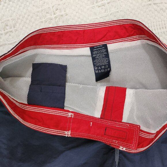 Tommy Hilfiger 2009 Board &Swim Shorts in Red White and Navy Blue colours. Size XL. Polyester. Mesh lined. Pocket back and leg, and one inside too. Great overall preloved condition, has one mark on the back as shown in photo illustrations-Please view(shiny like glue or nail polish/very small and hard to notice). 40 inches waist aprox. 8.5 inches inseam aprox.