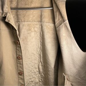 This is a great pre-owned men's coat, perfect for adding a touch of rugged style to your wardrobe; features a tan outer shell with a cozy, faux fur lining, button-up closure, and classic collared design, offering both warmth and a timeless look. It is in good condition and has been well-maintained.