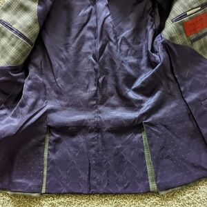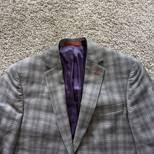 Stunning Grey pin stripe blazer from Ted Baker. It has purple accents and lining, buttons on the cuff and multiple pockets on the interior and exterior. Only worn by my partner for an even over the holidays so still in excellent condition!