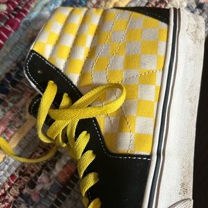 Vans high-top sneakers with black and yellow checkered pattern. Classic design with signature logo. Lightly used.