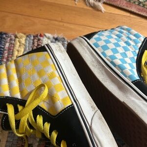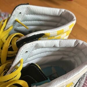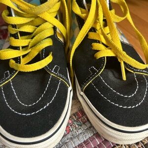Vans high-top sneakers with black and yellow checkered pattern. Classic design with signature logo. Lightly used.