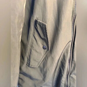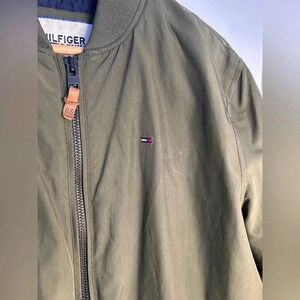Olive green winter jacket in size Medium by Tommy Hilfiger. It has a zip-up front and features a ribbed collar, cuffs, and hem. The jacket includes two front pockets with snap and one side pocket with zipper. Slightly longer in back than front with side slits. One side (see image) needs small sewing repair. 23” pit to pit 35” long