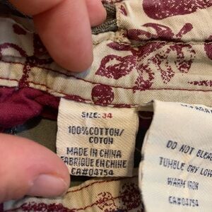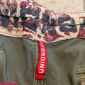 These classic olive green cargo shorts from UNIONBAY are a great addition to any casual wardrobe. Featuring multiple pockets for all your essentials and a comfortable fit, they're perfect for outdoor adventures, casual hangouts, or everyday wear. The shorts have a distressed/worn-in look, which adds to their relaxed style. The inside waistband has a unique floral or abstract print.