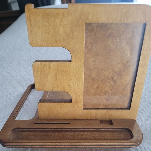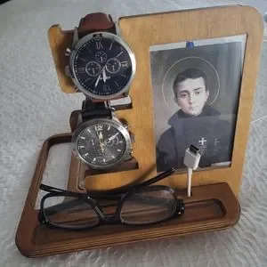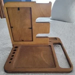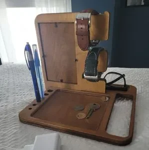 Solid wood men's valet night stand organizer. Holds watches, phone wallet, coins, pens, etc. Port to thread phone charging cord, and frame for photo. Items displayed with valet stand not included.