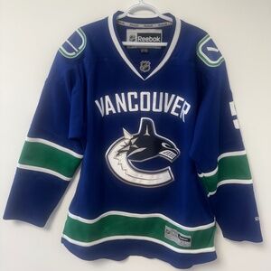 Support your team in classic style with the Men's Vancouver Canucks Derrick Pouliot Reebok Home Jersey. Featuring the iconic blue and green colorway and the signature orca crest, this jersey brings authentic NHL style to your game-day wardrobe.