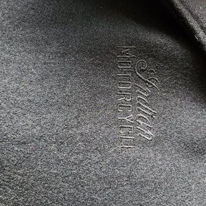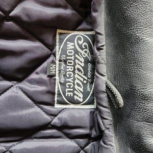 Black cloth with leather sleeves and collar. Quilted lining with inner pocket. Indian motorcycle logo embroidered tone-on-tone on front lapel and on back. Snap closures, ribbed cuffs and waistband. Excellent condition, hardly worn.